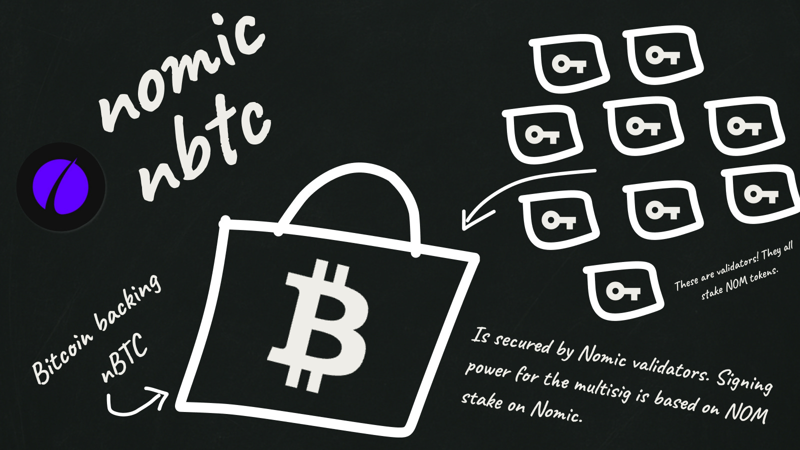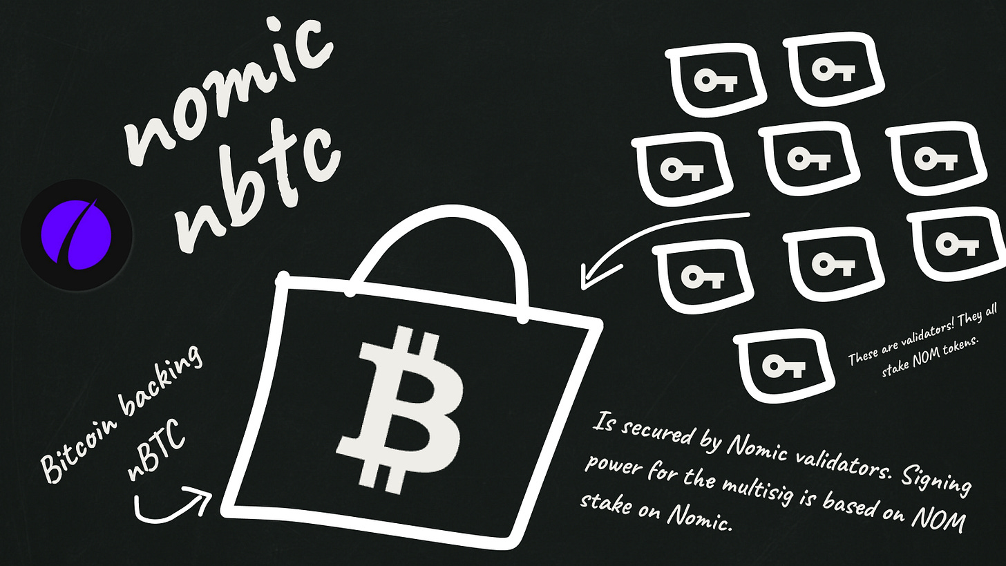 Nomic’s top 20 validators, by voting power, are responsible for managing a weighted multisig that secures bitcoin backing nBTC. The script is set up to where the signers, based on relative NOM token stake, have weighted voting power in the multisig.